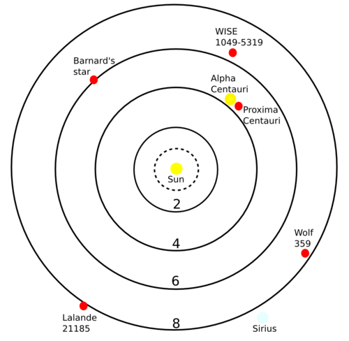 Proxima Centauri, the closest star to our own Sun, is about 40 trillion km away from the Earth. Alpha Centauri A and B are slightly farther away, at 42 trillion km away from us. Our closest star is 694 times farther away than Pluto is. These numbers are astronomically large! As the numbers are so large, astronomers do not use kilometres to measure the distances to stars, but use larger units based on the speed of light, which you will discover in the next section of this chapter.