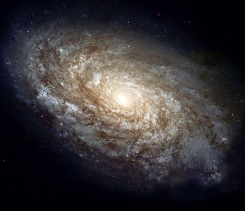 The image shows what scientists think our galaxy looks like. You can see the spiral arms of our Milky Way. These are bluish in colour and are filled with dust and gas and hot young stars. The thin dark wisps in the image are dust lanes, regions where the gas is very dusty. The central part of the galaxy is more orangey in colour than the spiral arms. This is because the stars found at the centre of the galaxy tend to be older and cooler than the young hot blue stars.