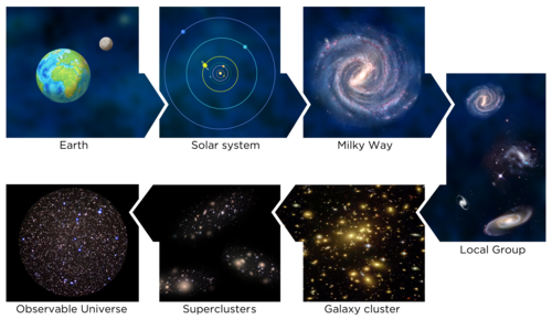 Have a look at the following diagram which shows the location of Earth in the Universe. You do not need to know this classification; this is included for your interest.