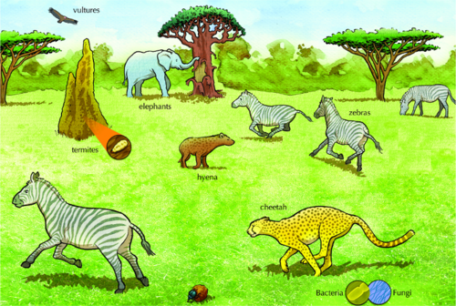 If all the zebra died, the ecosystem would become unbalanced. Firstly, the cheetah would not have a food source anymore and they would also in turn suffer and starve. The hyena would also have a depleted food source. There might perhaps be less dung for the dung beetle to use to lay its eggs. The grazing of the zebra also has an effect on the plants and so if the zebra all die out, the grass growth will increase.