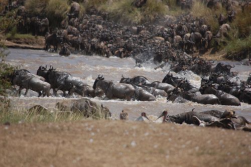 Lions, wildebeest, zebra, impala and vulture.