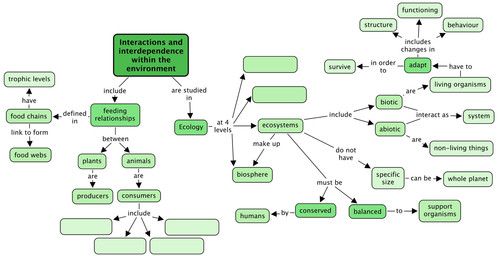 Remember that concept maps are different to mind maps in that concept maps have a hierarchical structure and show how concepts link together using arrows and linking words. Whereas mindmaps generally contain a central topic and individual branches coming out which do not necessarily link together. Mindmaps can also be a useful way of summarizing information and studying, however, we are using concept maps as they help to show linkages, which is very important in science. Help your learners to 'read' the concept map by showing them that the arrows show the direction in which concepts progress and are linked to each other. Learners might battle to find the other 2 levels in which we study ecology - help them by reminding them of the 4 levels, namely; populations, communities, ecosystems and the biosphere.