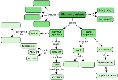 This concept map shows all that we have learnt about Microorganisms in this chapter. What types of microorganisms are there? Fill these into the 4 spaces below. How can we prevent the spread of harmful microorganisms? Fill in 2 of these actions in the spaces provided. In this chapter we learnt about useful microorganisms - what are two products we make using microorganisms? Fill these in.