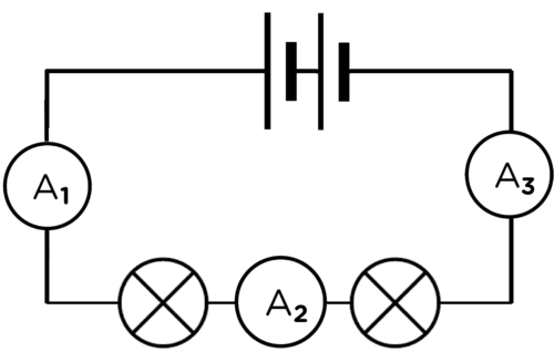 What is the relationship between the ammeter readings on A1, A2 and A3? In other words, how do the current strengths compare at these points in the circuit? Explain your answer. [3 marks]