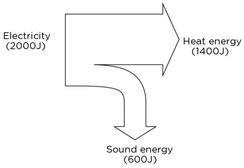 For example, a kettle uses about 2000 J of input energy, but only about 1400 J is used to heat the water. The remaining 600 J is wasted as sound. Here is the Sankey diagram to represent the energy transfer.