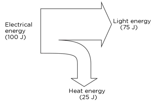 Draw a Sankey diagram for an LED if the input energy is 100 J, 75 J of energy is used to produce light and the rest is lost as heat.