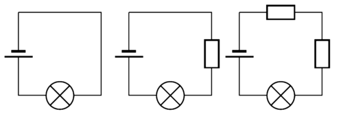 The first circuit has the brightest bulb because it has the least resistance and so it has the highest current. The third circuit has the highest resistance because it has two resistors connected in series with the light bulb. The more resistors connected in series, the higher the resistance and the lower the current.