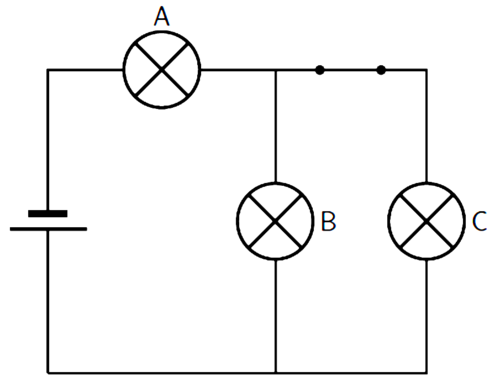This circuit has both series components (the cell and bulb A are in series) and a parallel branch consisting of bulb B and C.