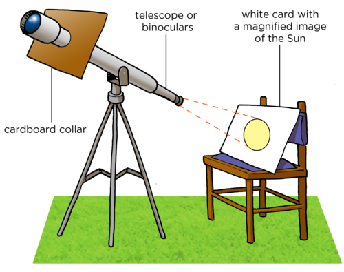 This is an outdoors activity. You will need a telescope or binoculars for this activity. An alternative activity is included after this,which does not need a telescope or binoculars.You will be projecting an image of the Sun onto a white card or screen for your learners to observe.