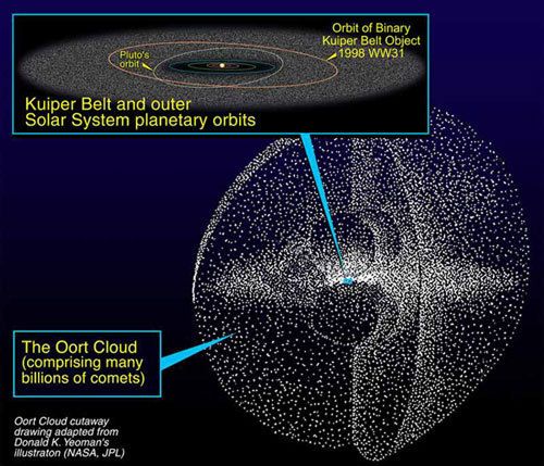 • The Oort Cloud is a hypothetical huge cloud of icy objects (comets) surrounding the Sun at the very edge of our solar system.