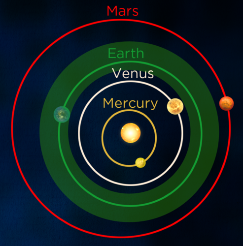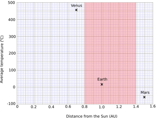 If the Earth were too close to the Sun it would be too hot and all the water would evaporate from the oceans, like it has on Venus. If the Earth were too far from the Sun it would be too cold, and all the water would be frozen, like on Mars. Earth is at just the right distance from the Sun to have liquid water on its surface. The other planets in the solar system are either too close or too far from the Sun. The range of distances that a planet can lie from the Sun and still have liquid water on the planet's surface is called the habitable zone. Estimates for the habitable zone in our solar system range from 0.8 - 1.4 astronomical units (AU).
