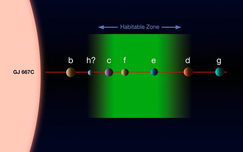 The following diagram shows the system of planets around the star Gliese 667C.