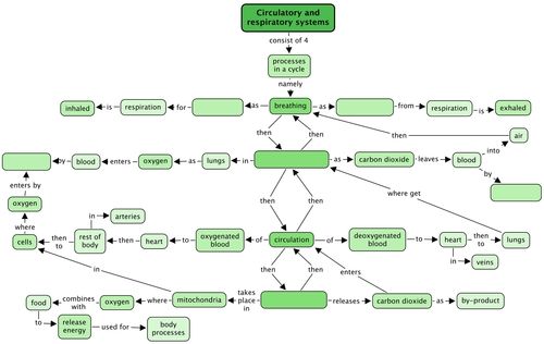 From what we have learnt in this chapter, we can say that the circulatory and respiratory systems consist of 4 processes which occur in a cycle. Two of these processes are named in the concept map, and there are spaces to write the other two. During breathing, what is the gas which is inhaled for respiration, and which is the gas which is exhaled from respiration? Fill these in too. What is the name for the process by which these gases move across the cell membranes?