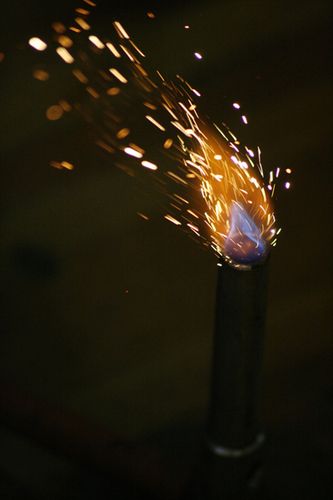 Steel wool spinning creates interesting photos as the iron burns in oxygen and creates orange sparks. http://www.flickr.com/photos/rockandrollfreak/7697586652/ Iron shavings look like sparks when they burn in the blue flame of a Bunsen burner.