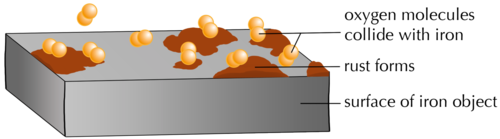Rust forms on the surface of an iron or steel object, when that surface comes into contact with oxygen. The oxygen molecules collide with the iron atoms on the surface of the object, and they react to form iron oxide. If we wanted to prevent that from happening, what would we have to do?