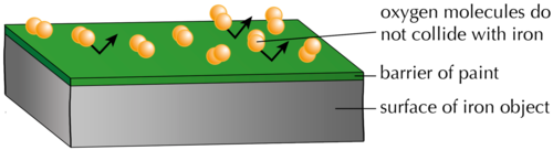 If we wanted to prevent the iron atoms and oxygen molecules from making contact, we would need to place a barrier between them. That is what we are doing when we paint an iron surface to protect it from rust.