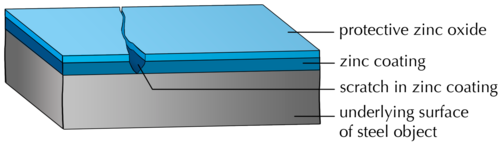 The following diagram shows a segment of galvanised steel, with a scratch in the protective coating. What do you think will happen to the steel that is exposed to the air by the scratch in the coating?