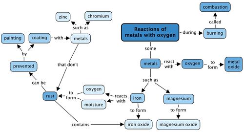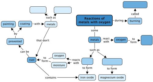 What is the proper name for 'burning'? Fill this into the concept map. Fill in the examples of the metals that you studied in this chapter. You will have to look at the products formed to know where to put which one. Lastly, give two examples of metals that you learnt about in this chapter which do not rust.