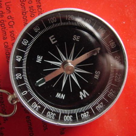 Compasses are mainly used in navigation to find direction on the earth. This works because the Earth itself has a magnetic field which is similar to that of a bar magnet (see the picture below). The compass needle aligns with the Earth's magnetic field direction and points north-south. Once you know where north is, you can figure out any other direction. A photograph of a compass is shown on the right.