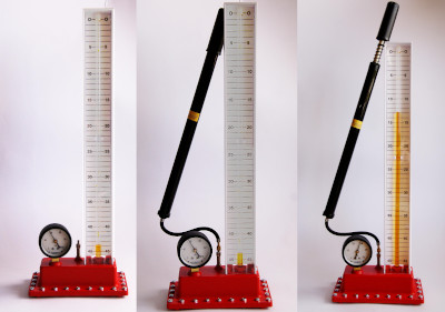 Use the pump to fill the syringe (or glass tube) until the pressure gauge reads the maximum value. Note the volume and the pressure reading.