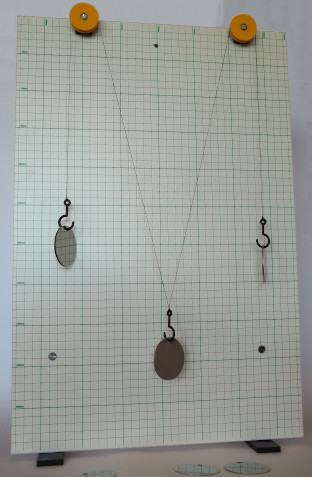 2. Set up four different forces by connecting a spring balance to the ring on the one side and some cord on the other side. Run the cord over a pulley and attach some weights to it. Work in a group to do this effectively.
