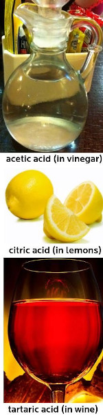 Do research on three naturally occurring acids, and one naturally occurring base. That is, acids and bases that are found mostly in plants (not man-made).