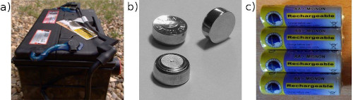 Figure 13.1: a) A car battery, b) rechargeable AA batteries and c) watch batteries.