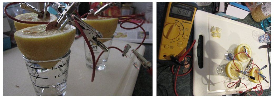 Figure 13.2: A current is produced by connecting lemons with zinc and copper metal. The reactions taking place here are electrochemical reactions.
