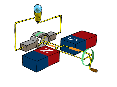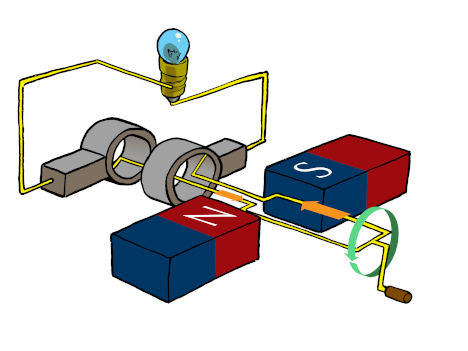 The principle of rotating a conductor in a magnetic field to generate current is used
