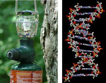Figure 4.1: A simple organic molecule, propane, can be used in a gas lamp (left). The complex organic molecule DNA carries the genetic code of a person and can be used to identify them.