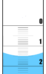 The surface of the water (the meniscus) is slightly higher at the edges of a container than in the middle. This is due to surface tension and the interaction between the water and the edge of the container (Figure 1.7). When measuring the volume in a burette (or measuring cylinder or pipette) you should look at the bottom of the meniscus. Where that lies is where you measure the volume. So in this example the meniscus is on the fifth line below the large line that represents \(\text{1}\) \(\text{ml}\). Therefore the volume is \(\text{1,5}\) \(\text{ml}\).